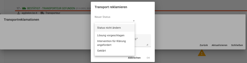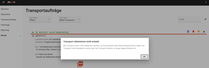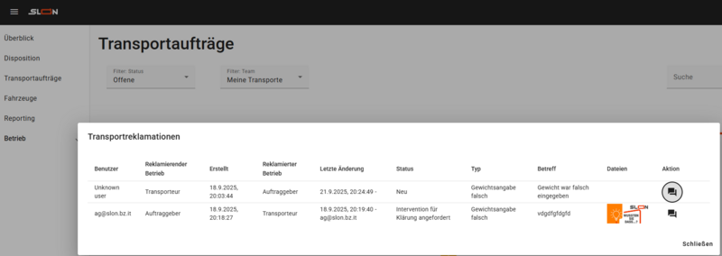 - In der Transportübersicht erscheint ein Symbol ⚠️, über das die Reklamation eingesehen werden kann.