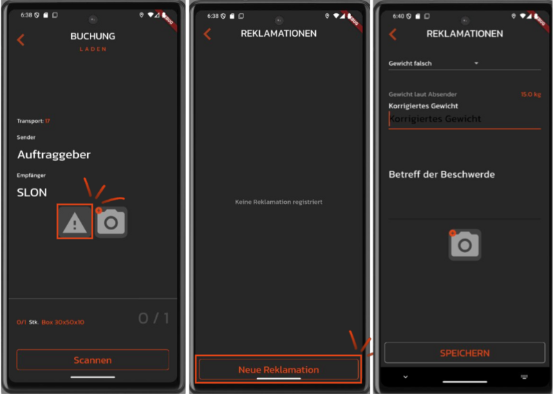 Reklamationen können vom ausführenden Transporteur direkt während des Lade- oder Entladevorgangs erfasst werden, solange der Transport noch nicht abgeschlossen ist.
