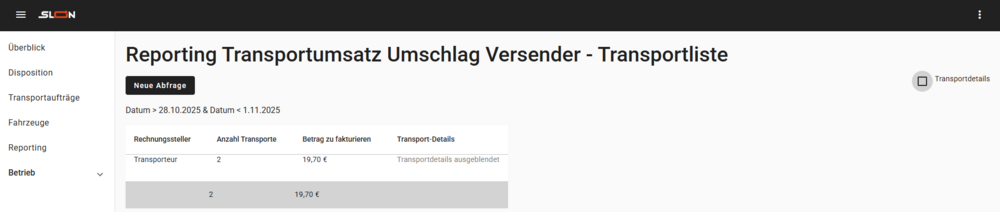 Reporting nach Transportumsatz (Transportliste)